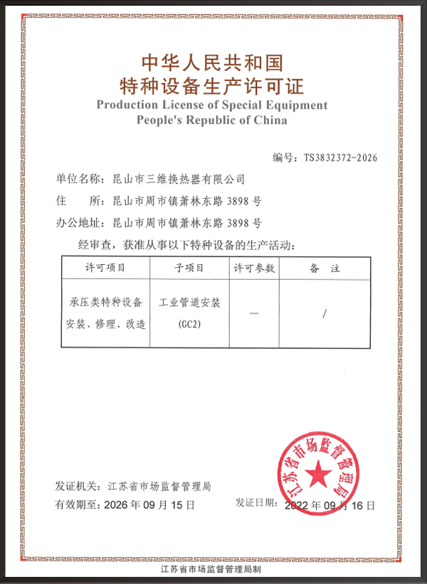 A2壓力容器制造許可證,D1/D2壓力容器設計許可證;GC2管道安裝許可證;ASME U/NB鋼印;ISO9001、ISO45001、ISO14001體系認證證書等。